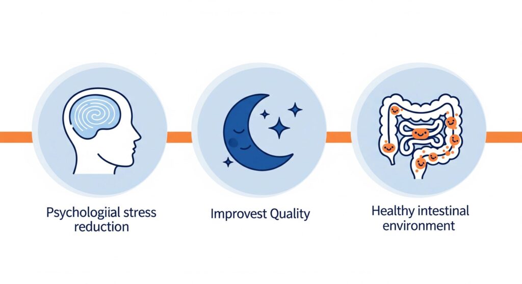 寝付きが悪かったり、夜中に何度も目が覚めてしまう方にとって、これは最も気になる効果ですよね。 眠りの深さを高め、質の高い睡眠へと導いてくれるのです。 - 腸内環境を整える