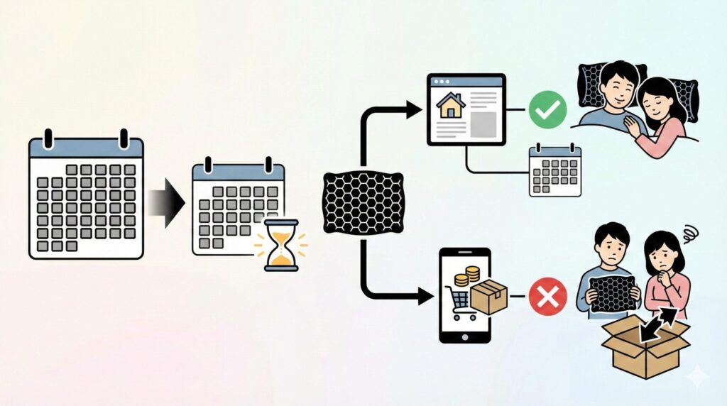 だいたい1,500円〜2,000円くらいの実費がかかる計算ですね。でも、これを「高い」と思うか、「1ヶ月間のレンタル試着料」と思うか。お店で5分寝転がるだけじゃわからない寝心地を、自宅のベッドで30日間じっくり試せる。もし合わなければ、ランチ1回分くらいの負担で済む。そう考えれば、かなり良心的な「保険」だと思いませんか?