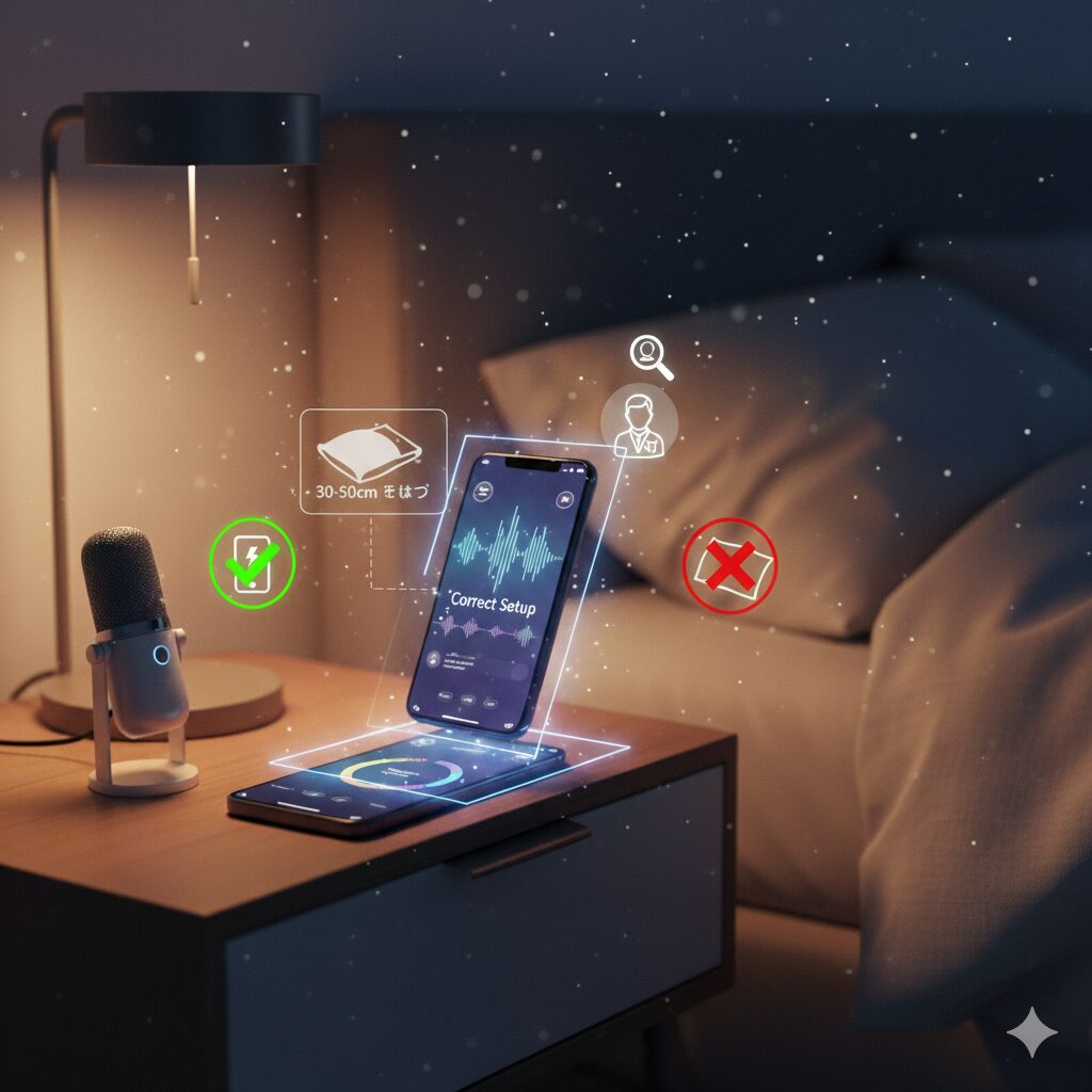 枕元から30~50cm離れた、安定した場所に置くのがベストです。いびきや寝言をしっかり拾いつつ、寝返りによるノイズを減らせます。 - こんな置き方はNG!: