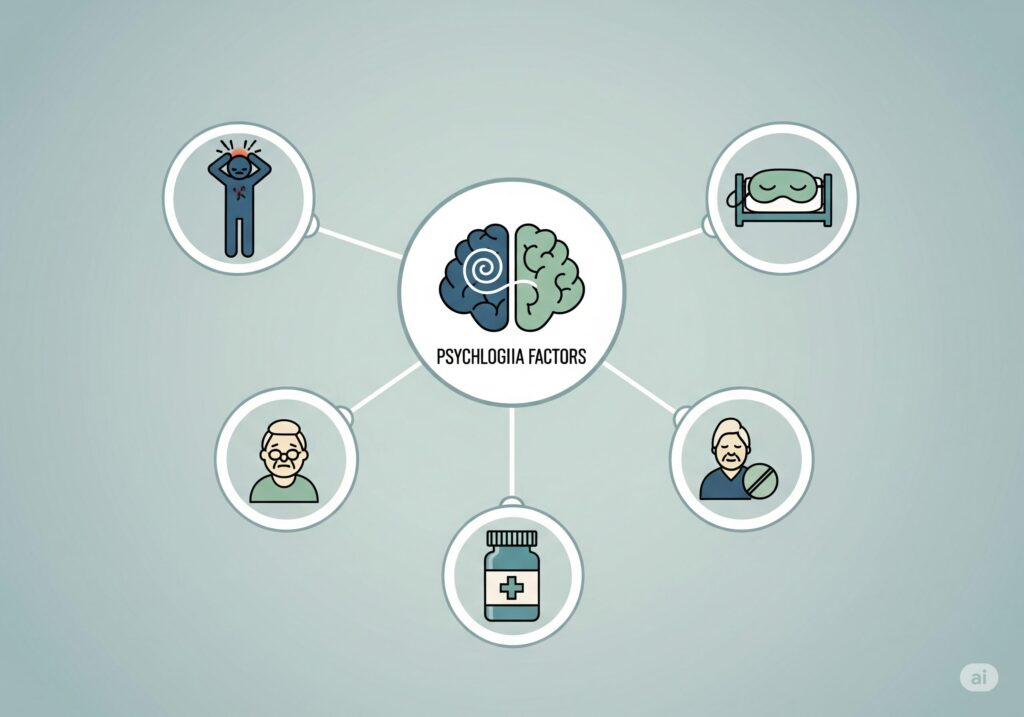 患者さんの睡眠問題は、たった一つの原因で起こることはめったにありません。まるで、いろいろな色の糸が複雑に絡み合った毛玉みたいなのです。たとえば、病気に対する不安(心理的要因)が夜間の不眠を引き起こし、それが生活リズムの乱れ(環境的要因)につながって、さらに病気の回復を遅らせる…なんていう負の連鎖も起こりうるんですよ 。